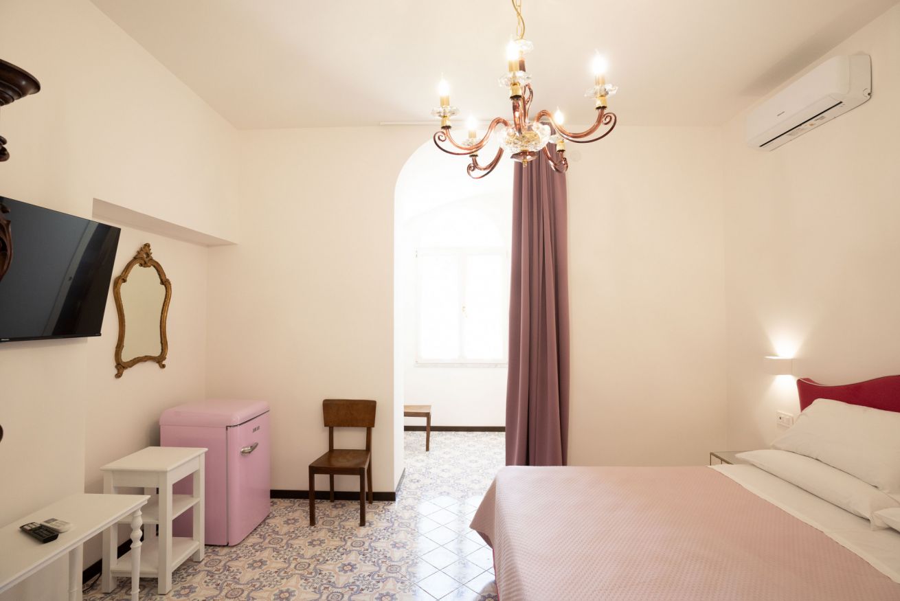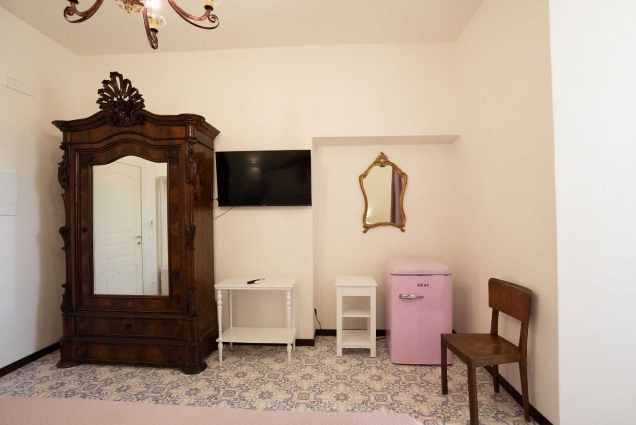 La camera matrimoniale, raffinata e accogliente, rappresenta la soluzione ideale per chi desidera un soggiorno all’insegna del comfort e della tranquillità. Ampia e luminosa, è dotata di un elegante bagno privato. La stanza, climatizzata e impreziosita da una suggestiva vista sul giardino, offre un’atmosfera rilassante e curata in ogni dettaglio. A disposizione degli ospiti una TV a schermo piatto per l’intrattenimento, un minibar assortito, un set per la preparazione di tè e caffè e un ampio armadio per garantire ordine e funzionalità.